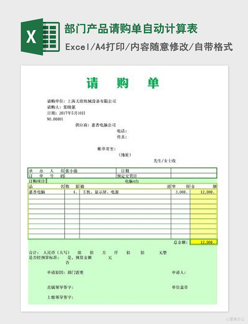 20XX部门产品请购单自动计算表表格模板下载到电脑里面,请使用Microsoft Office或wps等相关软件打开,作品中主体文字及图片可替换修改,文字修改可直接点击文本框进行编辑,图片更改可选中图片后单击鼠标右键选择更换图片,也可根据自身需求增加和删除作品中的内容文本。