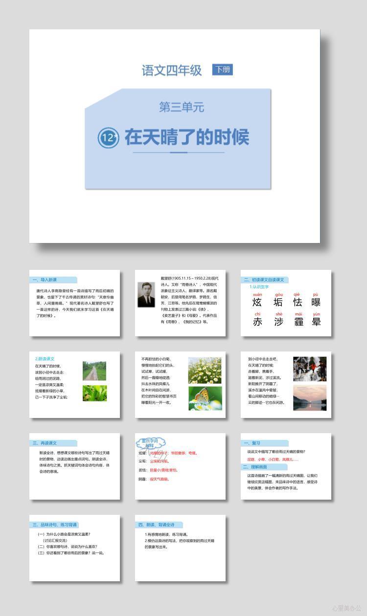 在天晴了的时候PPT课文课件下载到电脑里面,请使用Microsoft Office 2010或wps2016以上版本 等相关软件打开,作品中主体文字及图片、音频、视频可替换修改,文字修改可直接点击文本框进行编辑,图片更改可选中图片后单击鼠标右键选择更换图片,也可根据自身需求增加和删除作品中的内容文本。