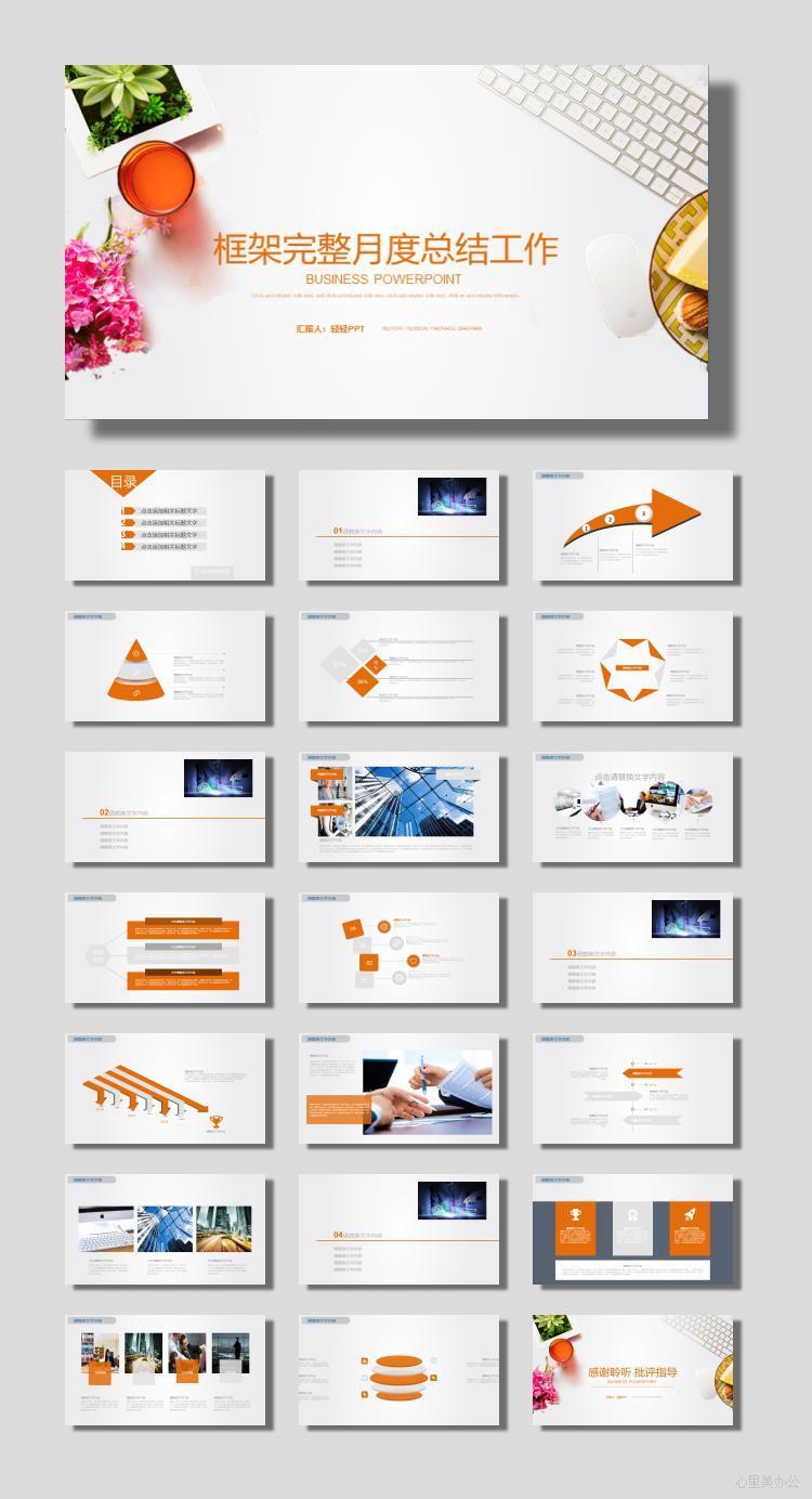 橙色清新办公场景背景的月度工作总结PPT模板下载到电脑里面,请使用Microsoft Office 2010上版本软件打开编辑修改(其它软件打开可能出现文件不能正常编辑或效果消失),作品中主体文字、图片、视频、音频可替换修改,文字修改可直接点击文本框进行编辑,图片更改可选中图片后单击鼠标右键选择更换图片,也可根据自身需求增加和删除作品中的内容文本。