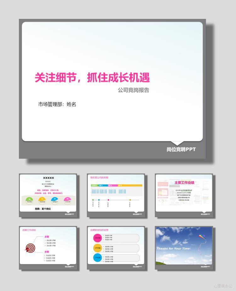 岗位竞聘工作汇报PPT下载下载到电脑里面,请使用Microsoft Office 2010上版本软件打开编辑修改(其它软件打开可能出现文件不能正常编辑或效果消失),作品中主体文字、图片、视频、音频可替换修改,文字修改可直接点击文本框进行编辑,图片更改可选中图片后单击鼠标右键选择更换图片,也可根据自身需求增加和删除作品中的内容文本。