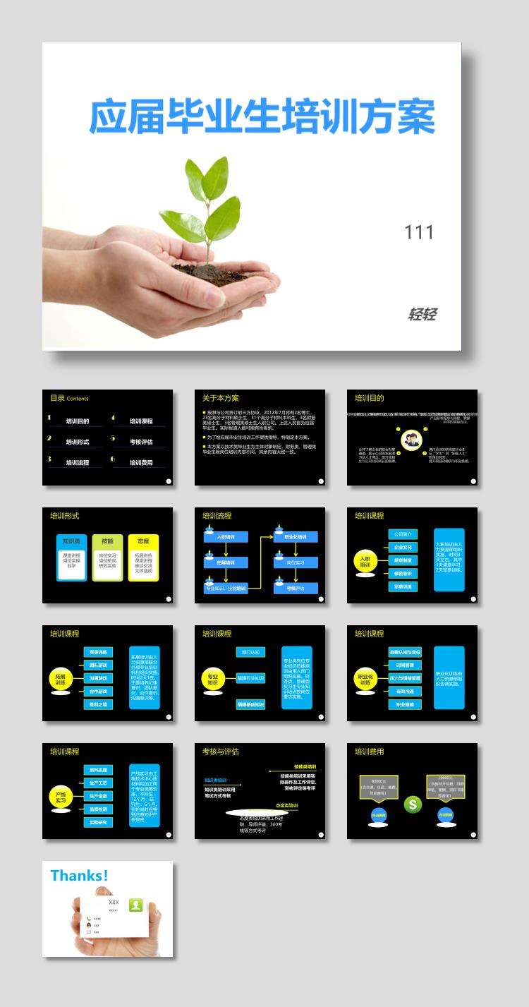 应届毕业生培训方案PPT课件免费下载下载到电脑里面,请使用Microsoft Office 2010以上版本 等相关软件打开,作品中主体文字及图片可替换修改,文字修改可直接点击文本框进行编辑,图片更改可选中图片后单击鼠标右键选择更换图片,也可根据自身需求增加和删除作品中的内容文本。