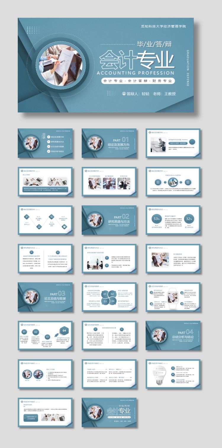 蓝色雅致会计专业毕业答辩PPT模板下载到电脑里面,请使用Microsoft Office 2010上版本软件打开编辑修改(其它软件打开可能出现文件不能正常编辑或效果消失),作品中主体文字、图片、视频、音频可替换修改,文字修改可直接点击文本框进行编辑,图片更改可选中图片后单击鼠标右键选择更换图片,也可根据自身需求增加和删除作品中的内容文本。