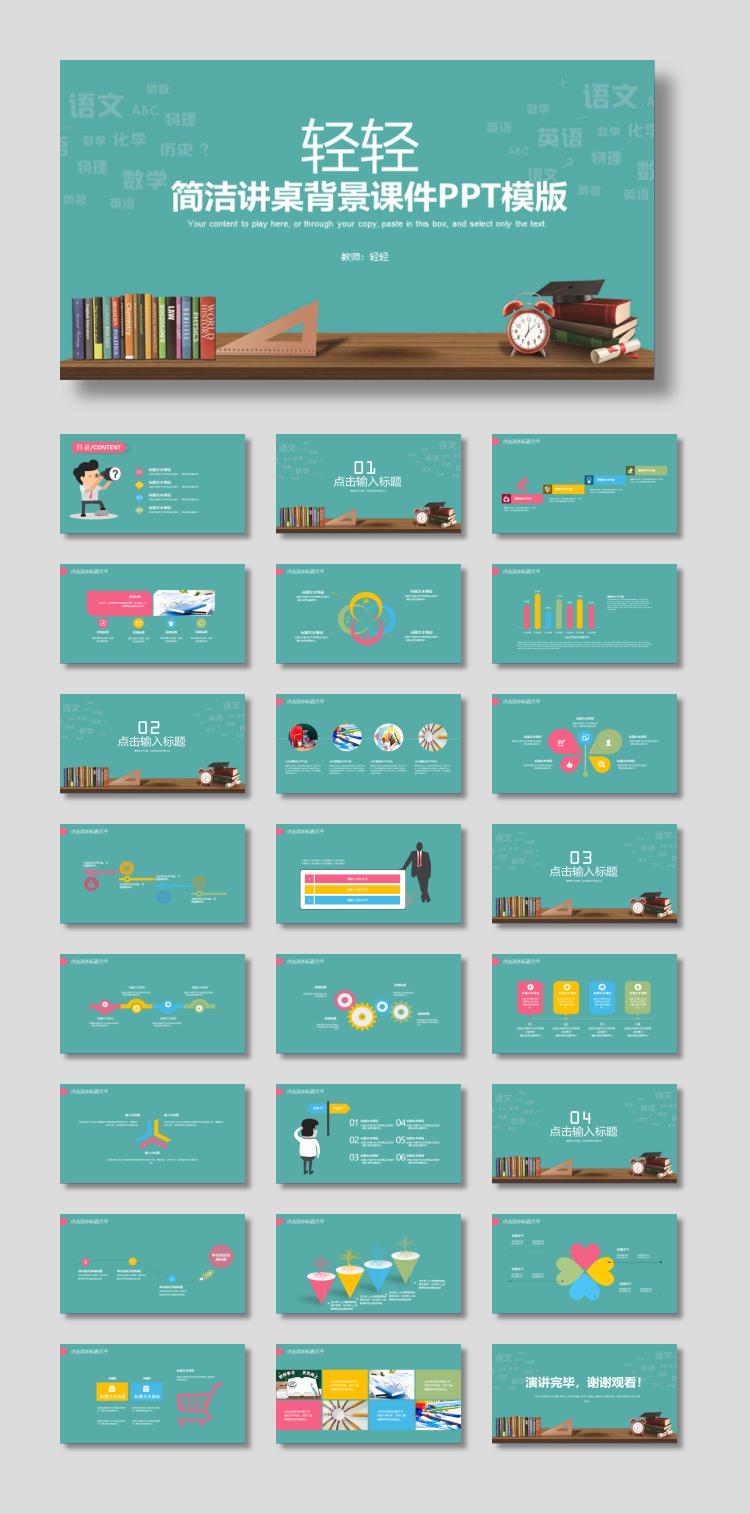简洁讲桌背景的教学PPT课件模板 下载到电脑上以后,请使用Microsoft Office2010软件以上版本打开,作品中主体文字及图片可替换修改,文字修改可直接点击文本框进行编辑,图片更改可选中图片后单击鼠标右键选择更换图片,也可根据自身需求增加和删除作品中的内容文本。