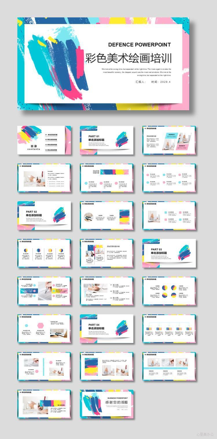 彩色水彩涂鸦背景的儿童绘画美术培训PPT模板下载到电脑里面,请使用Microsoft Office 2010以上版本 等相关软件打开,作品中主体文字及图片可替换修改,文字修改可直接点击文本框进行编辑,图片更改可选中图片后单击鼠标右键选择更换图片,也可根据自身需求增加和删除作品中的内容文本。