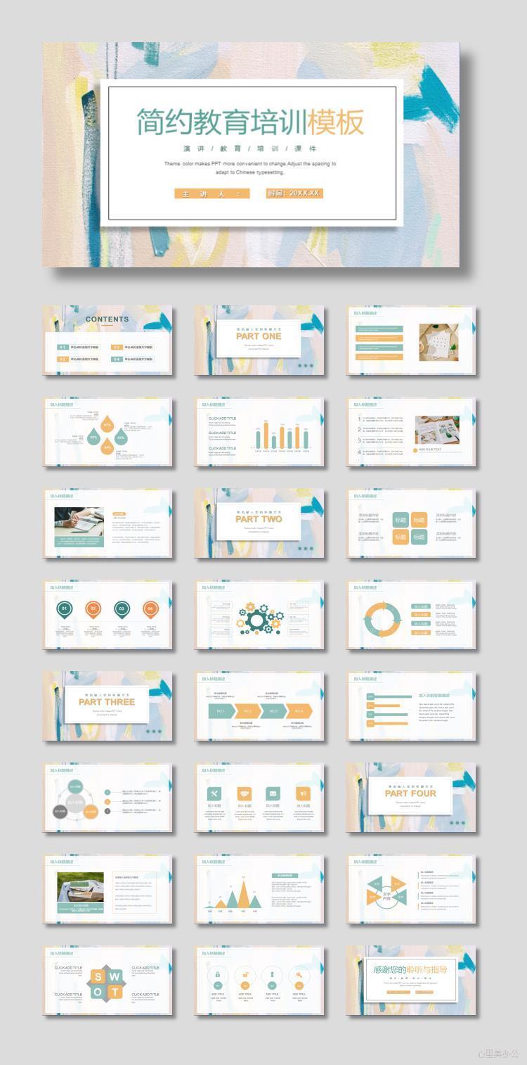 彩色油画笔触背景的教育培训PPT模板下载下载到电脑里面,请使用Microsoft Office 2010以上版本 等相关软件打开,作品中主体文字及图片可替换修改,文字修改可直接点击文本框进行编辑,图片更改可选中图片后单击鼠标右键选择更换图片,也可根据自身需求增加和删除作品中的内容文本。