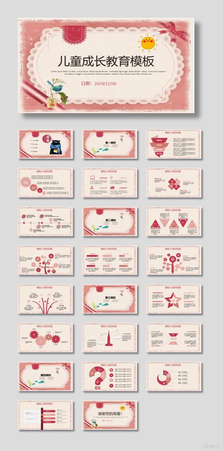 红色复古花纹图案背景的儿童成长教育PPT模板下载