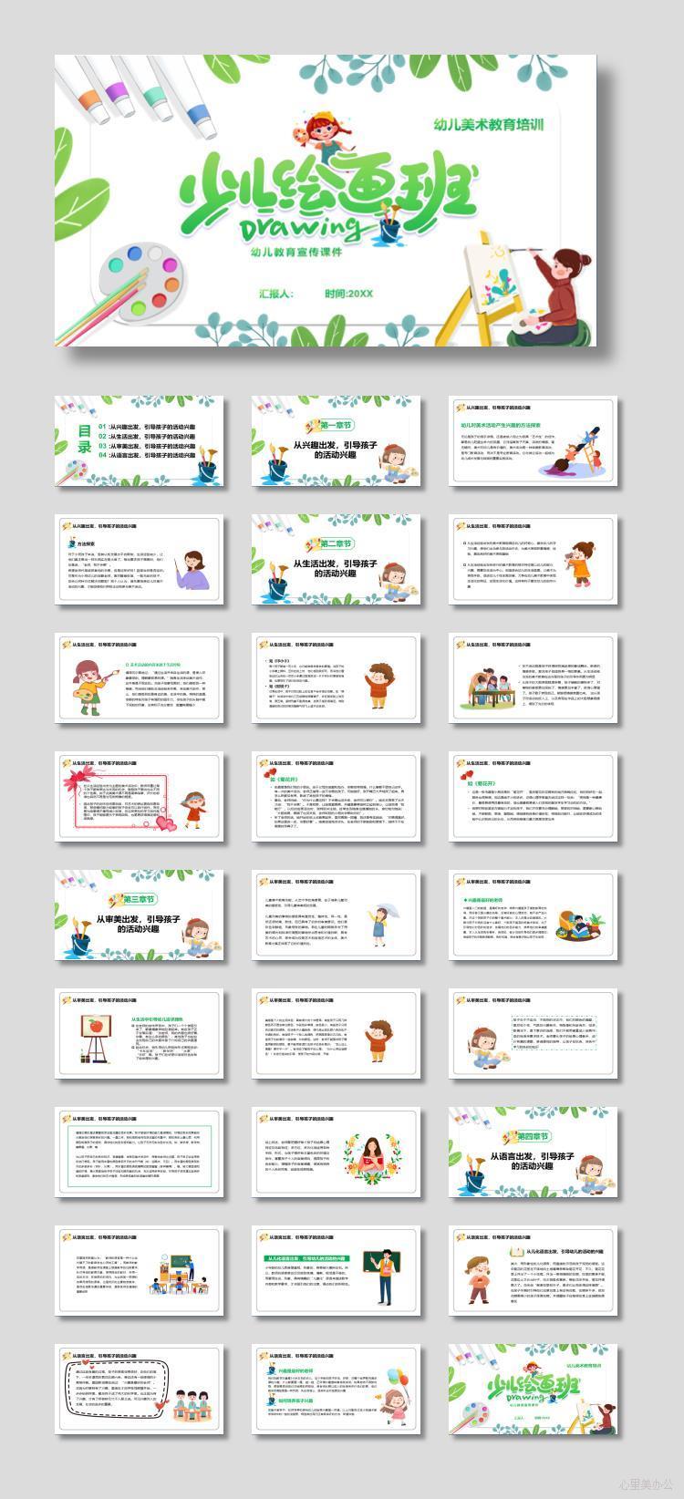 绿色画画的女孩背景少儿绘画班美术教育培训PPT模板下载到电脑里面,请使用Microsoft Office 2010以上版本 等相关软件打开,作品中主体文字及图片可替换修改,文字修改可直接点击文本框进行编辑,图片更改可选中图片后单击鼠标右键选择更换图片,也可根据自身需求增加和删除作品中的内容文本。