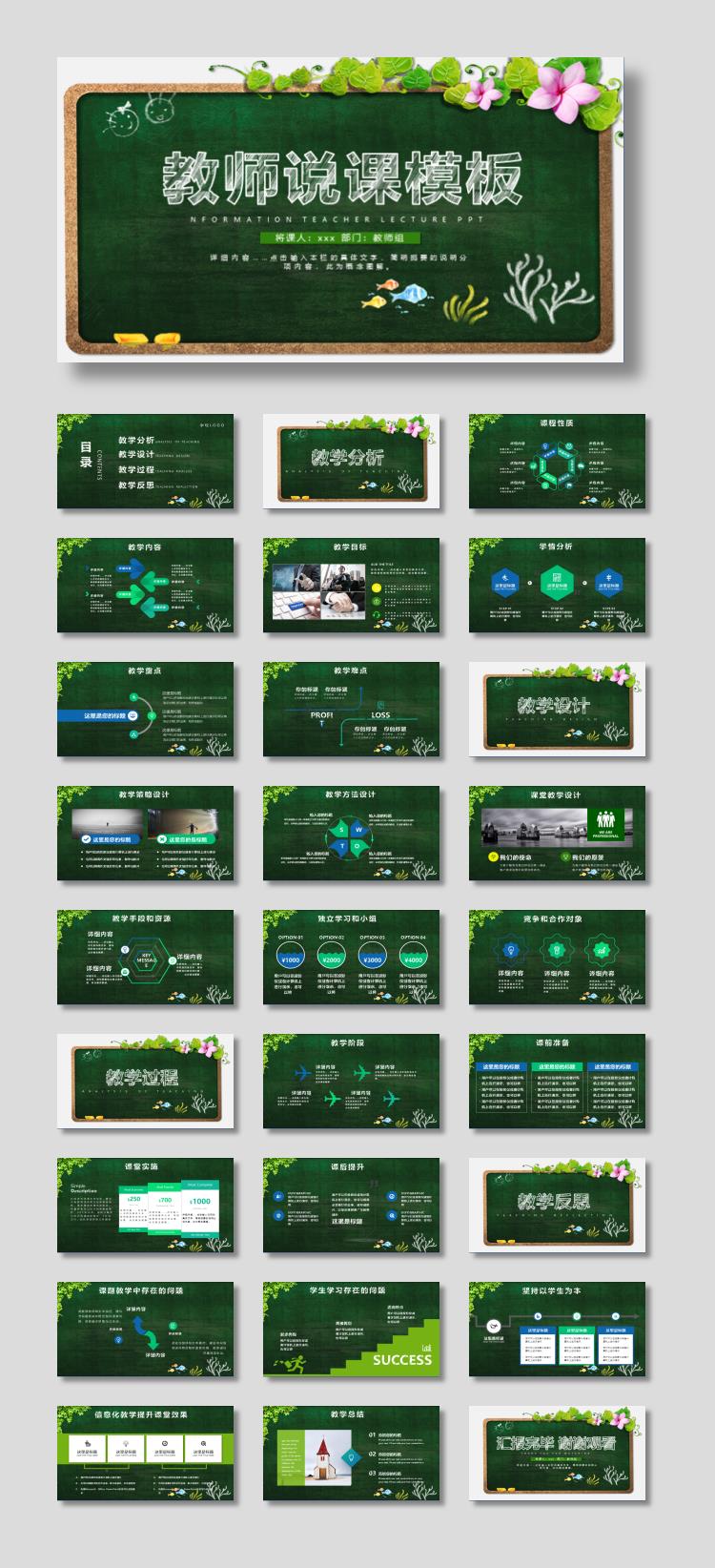 绿色黑板与藤蔓植物背景教学说课PPT模板下载 下载到电脑上以后,请使用Microsoft Office2010软件以上版本打开,作品中主体文字及图片可替换修改,文字修改可直接点击文本框进行编辑,图片更改可选中图片后单击鼠标右键选择更换图片,也可根据自身需求增加和删除作品中的内容文本。