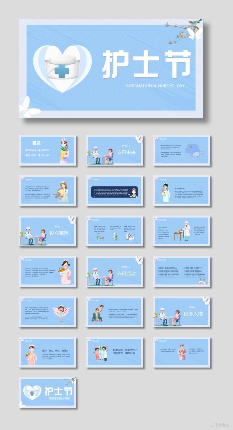 护士帽背景的国际护士节介绍PPT模板下载到电脑里面,请使用Microsoft Office 2010以上版本 等相关软件打开,作品中主体文字及图片可替换修改,文字修改可直接点击文本框进行编辑,图片更改可选中图片后单击鼠标右键选择更换图片,也可根据自身需求增加和删除作品中的内容文本。