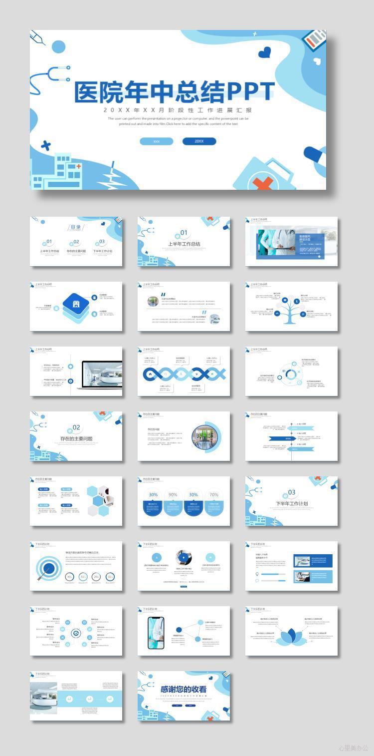 蓝色医院年中工作总结PPT模板下载到电脑里面,请使用Microsoft Office 2010以上版本 等相关软件打开,作品中主体文字及图片可替换修改,文字修改可直接点击文本框进行编辑,图片更改可选中图片后单击鼠标右键选择更换图片,也可根据自身需求增加和删除作品中的内容文本。