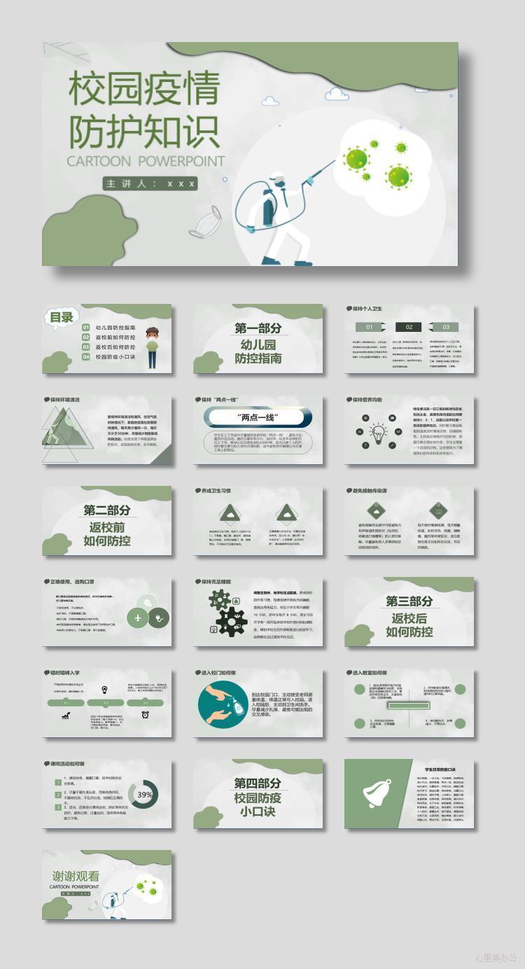 绿色卡通校园疫情防护知识PPT模板下载到电脑里面,请使用Microsoft Office 2010以上版本 等相关软件打开,作品中主体文字及图片可替换修改,文字修改可直接点击文本框进行编辑,图片更改可选中图片后单击鼠标右键选择更换图片,也可根据自身需求增加和删除作品中的内容文本。