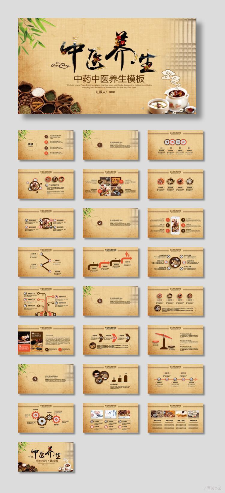 中药背景的中医养生PPT模板下载下载到电脑里面,请使用Microsoft Office 2010以上版本 等相关软件打开,作品中主体文字及图片可替换修改,文字修改可直接点击文本框进行编辑,图片更改可选中图片后单击鼠标右键选择更换图片,也可根据自身需求增加和删除作品中的内容文本。