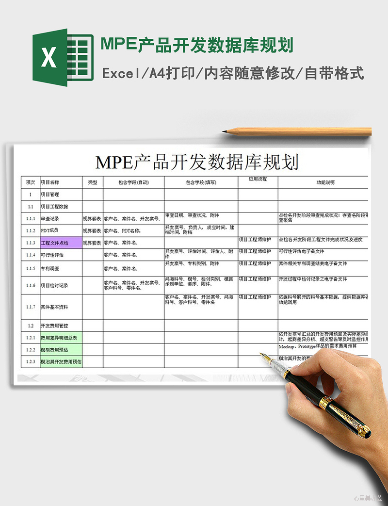 20XXMPE产品开发数据库规划表格模板下载到电脑里面,请使用Microsoft Office或wps等相关软件打开,作品中主体文字及图片可替换修改,文字修改可直接点击文本框进行编辑,图片更改可选中图片后单击鼠标右键选择更换图片,也可根据自身需求增加和删除作品中的内容文本。