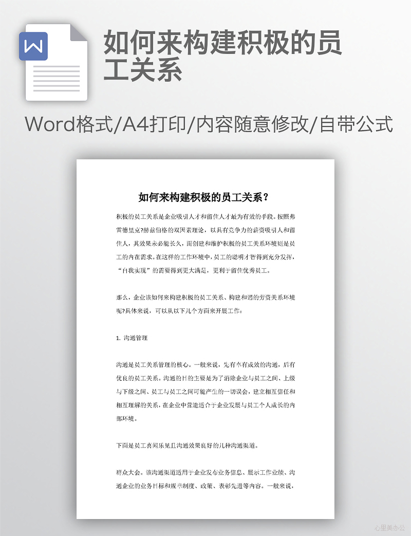 如何来构建积极的员工关系下载到电脑里面,请使用Microsoft Office或wps等相关软件打开,作品中主体文字及图片可替换修改,文字修改可直接点击文本框进行编辑,图片更改可选中图片后单击鼠标右键选择更换图片,也可根据自身需求增加和删除作品中的内容文本。