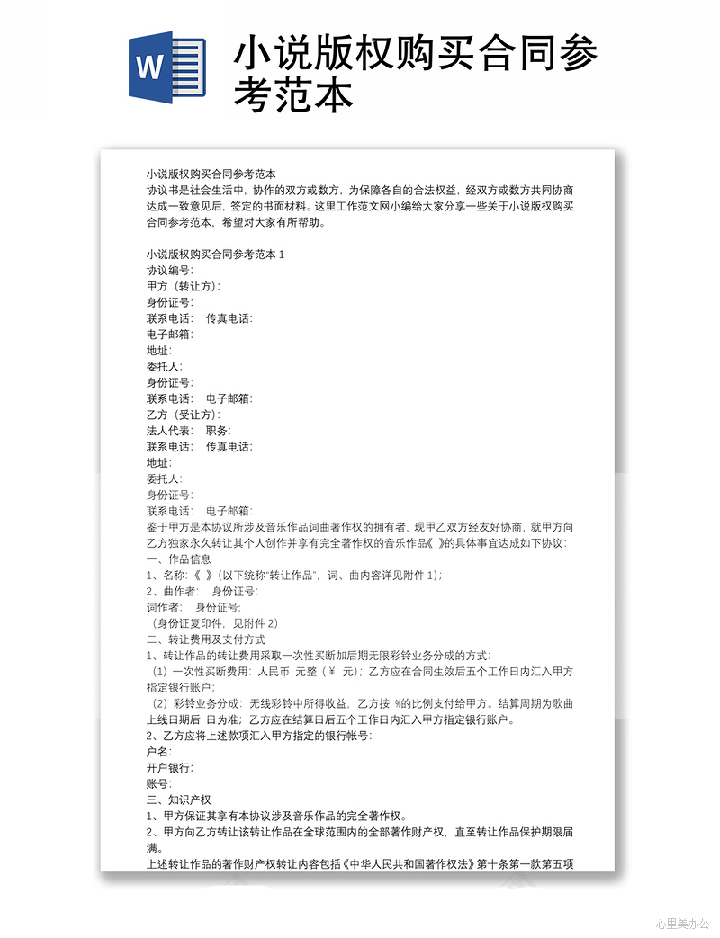 小说版权购买合同参考范本下载到电脑里面,请使用Microsoft Office 2010或wps2016以上版本 等相关软件打开,作品中主体文字及图片可替换修改,文字修改可直接点击文本框进行编辑,图片更改可选中图片后单击鼠标右键选择更换图片,也可根据自身需求增加和删除作品中的内容文本。