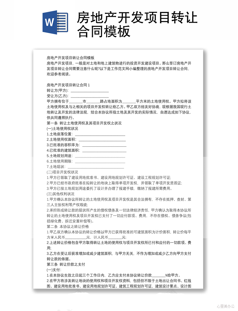 房地产开发项目转让合同模板下载到电脑里面,请使用Microsoft Office 2010或wps2016以上版本 等相关软件打开,作品中主体文字及图片可替换修改,文字修改可直接点击文本框进行编辑,图片更改可选中图片后单击鼠标右键选择更换图片,也可根据自身需求增加和删除作品中的内容文本。