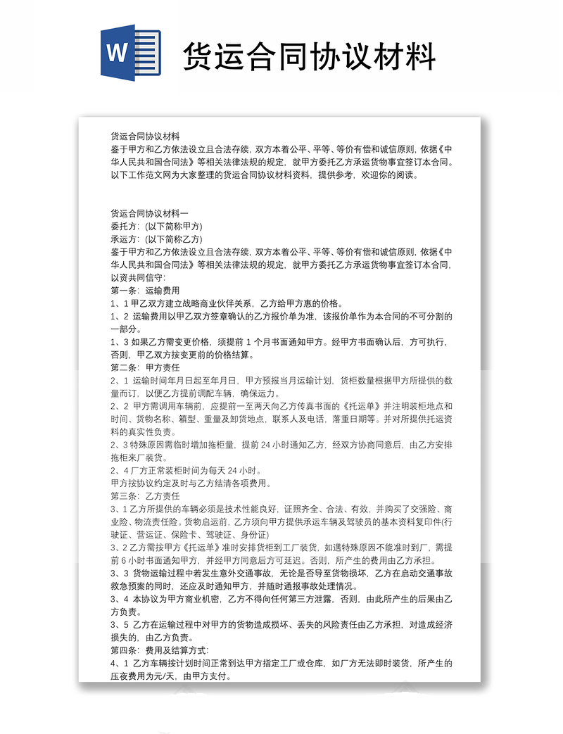 货运合同协议材料下载到电脑里面,请使用Microsoft Office 2010或wps2016以上版本 等相关软件打开,作品中主体文字及图片可替换修改,文字修改可直接点击文本框进行编辑,图片更改可选中图片后单击鼠标右键选择更换图片,也可根据自身需求增加和删除作品中的内容文本。
