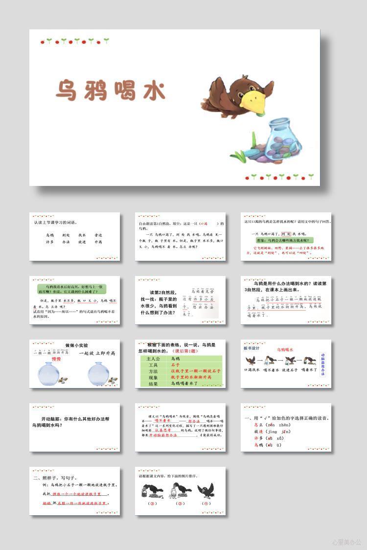 乌鸦喝水PPT语文优质课件下载到电脑里面,请使用Microsoft Office 2010或wps2016以上版本 等相关软件打开,作品中主体文字及图片可替换修改,文字修改可直接点击文本框进行编辑,图片更改可选中图片后单击鼠标右键选择更换图片,也可根据自身需求增加和删除作品中的内容文本。